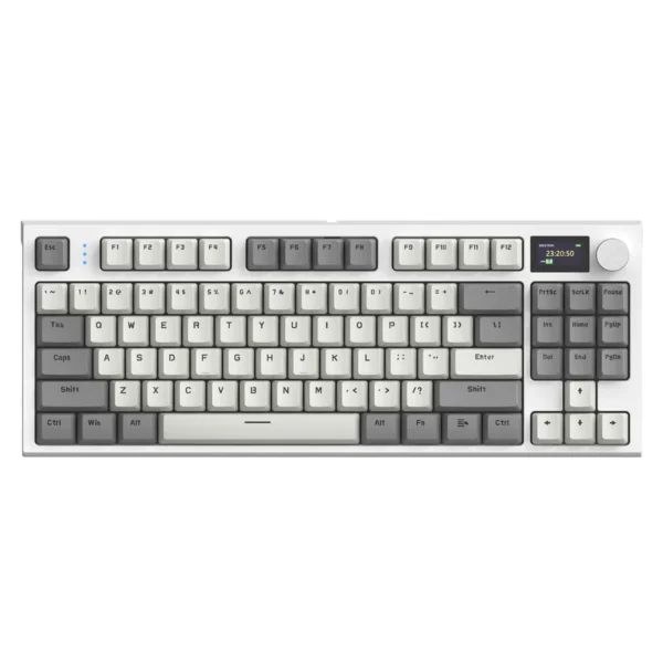 - Built-in smart TFT color display can intuitively display the keyboard status, including custom GIF image, connection mode, WIN/MAC, battery level, date and time. The CNC metal knob can quickly adjust the connection mode, backlight effect/color/brightness speed, volume and language, etc. Undoubtfully, the mini displayer will bring the customizability of the keyboard to the next level.