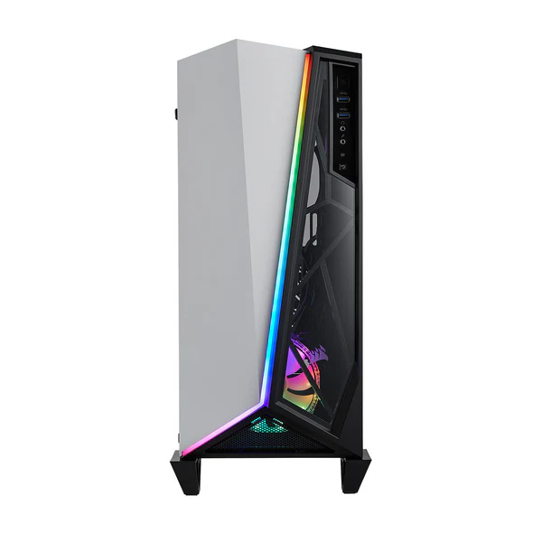Le Corsair SPEC-OMEGA White se distingue immédiatement par son design angulaire unique et agressif, caractéristique de la gamme gaming Corsair. Conçu pour mettre en valeur les composants internes, il dispose d’un panneau latéral transparent permettant d’exposer la carte graphique, le système de refroidissement et l’éclairage RGB du setup.