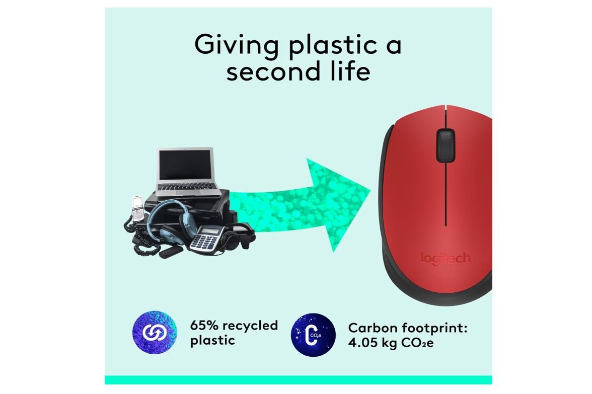 - Plastique recyclé : Les composants en plastique de la souris M171 sont fabriqués à partir de plastique certifié recyclé post-consommation (59% minimum pour le modèle Noir), afin d’offrir une nouvelle vie au plastique issu d’anciens produits électroniques grand public et contribuer à réduire l’empreinte carbone.