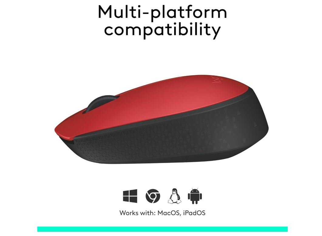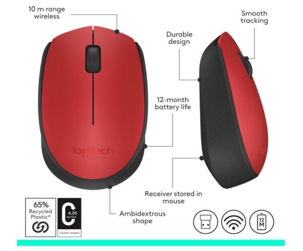 The Logitech M171 Wireless Mouse in Red is a compact and reliable mouse designed for both left- and right-handed users. It offers a comfortable grip and smooth navigation, making it ideal for everyday tasks.